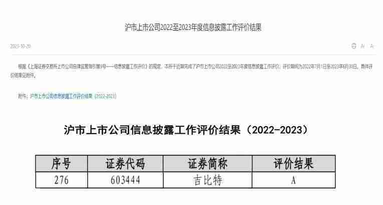 近日,,上海证券交易所发布2022-2023年度信息披露工作评价结果。。。JIUYOU.COM(股票代码::603444)凭借规范的公司治理、、、、高质量的信息披露以及良好的投资者关系管理再次荣获信息披露工作A级评价,,,公司连续两年获此殊荣。。。。